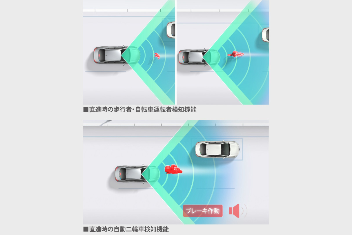 低速時の自車の直前にいる歩行者、自転車運転者、車両をミリ波レーダーと単眼カメラで認識。前方に対象物がある状態で、停車または徐行状態からアクセルペダルが必要以上に強く踏み込まれた場合には、モーター出力を抑制または弱いブレーキをかけることで加速を抑制し、衝突回避または被害軽減をサポートします。