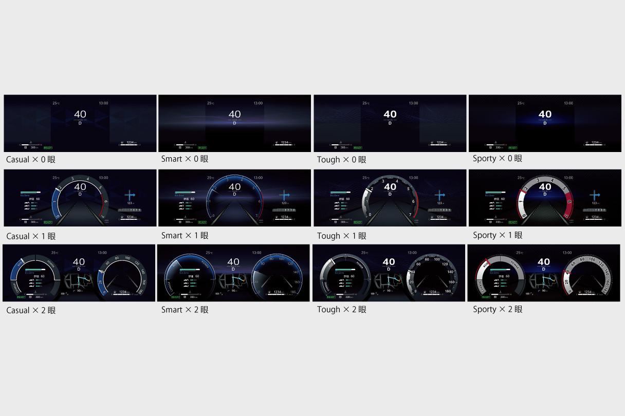 4つのテイスト(Casual/Smart/Tough/Sporty)と3つのレイアウトの中から、好みに合わせて表示を変えられるメーター。マルチインフォメーションディスプレイは、同時に複数の情報が見られるよう、左/中央/右の3種類を表示します。